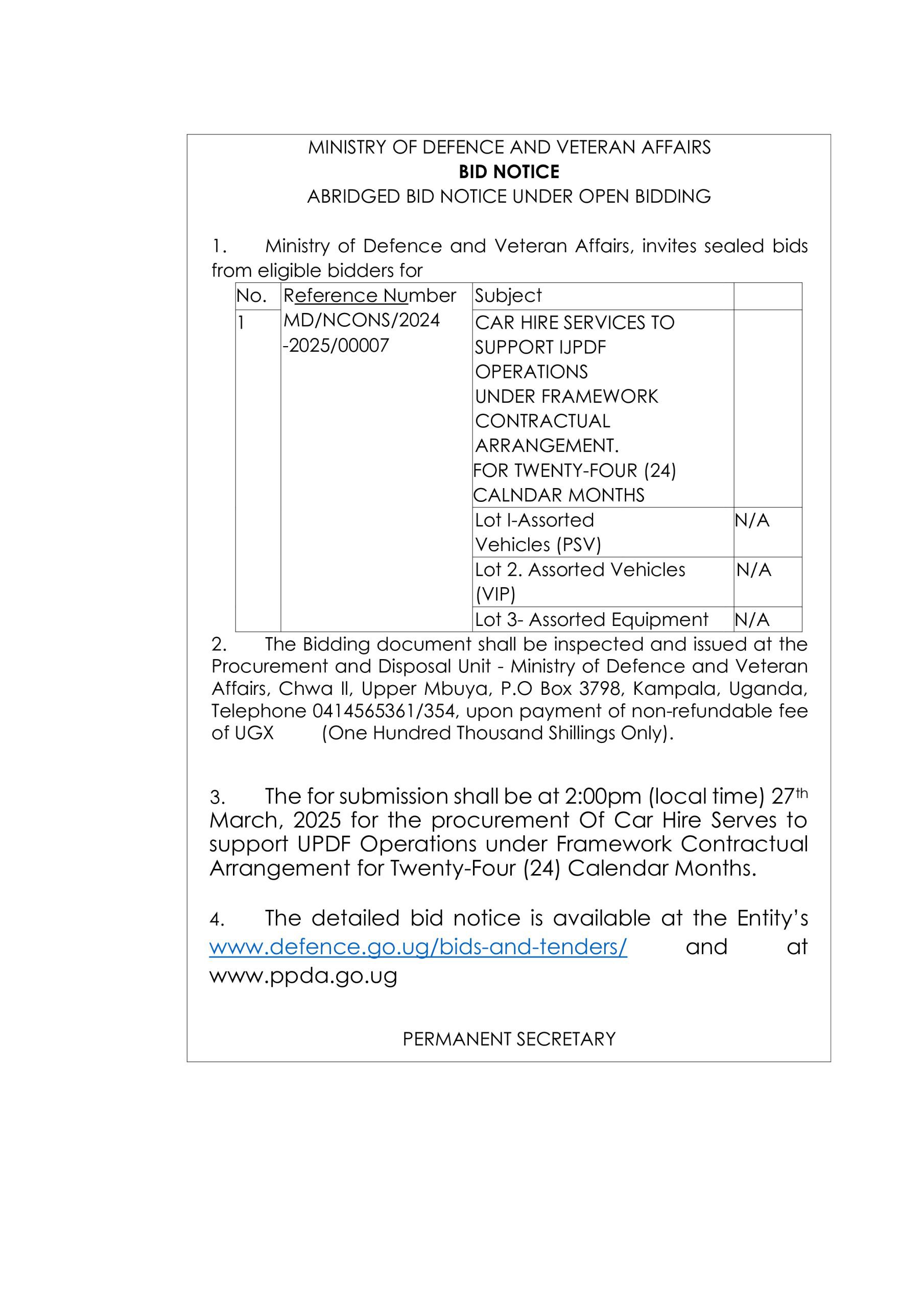 3. The for submission shall be at 2:00pm (local time) 27th March, 2025 for the procurement Of Car Hire Serves to support UPDF Operations under Framework Contractual Arrangement for Twenty-Four (24) Calendar Months.