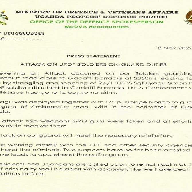 Last evening an Attack occurred on our Soldiers guarding at Ambercourt road close to Gadaffi barracks at 2050hrs leading to the death by strangling and shooting of RA/110575 Sgt