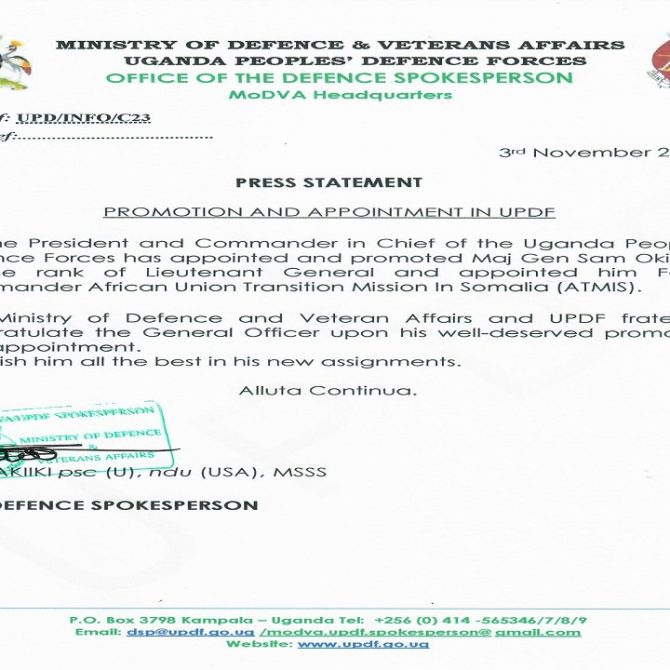H.E the President and Commander in Chief of the Uganda Peoples’ Defence Forces has appointed and promoted Maj Gen Sam Okiding to the rank of Lieutenant General and appointed him