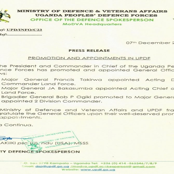 H.E the President and Commander in Chief of the Uganda Peoples’ Defence Forces has promoted and appointed General Officers as follows: Major General Francis Takirwa